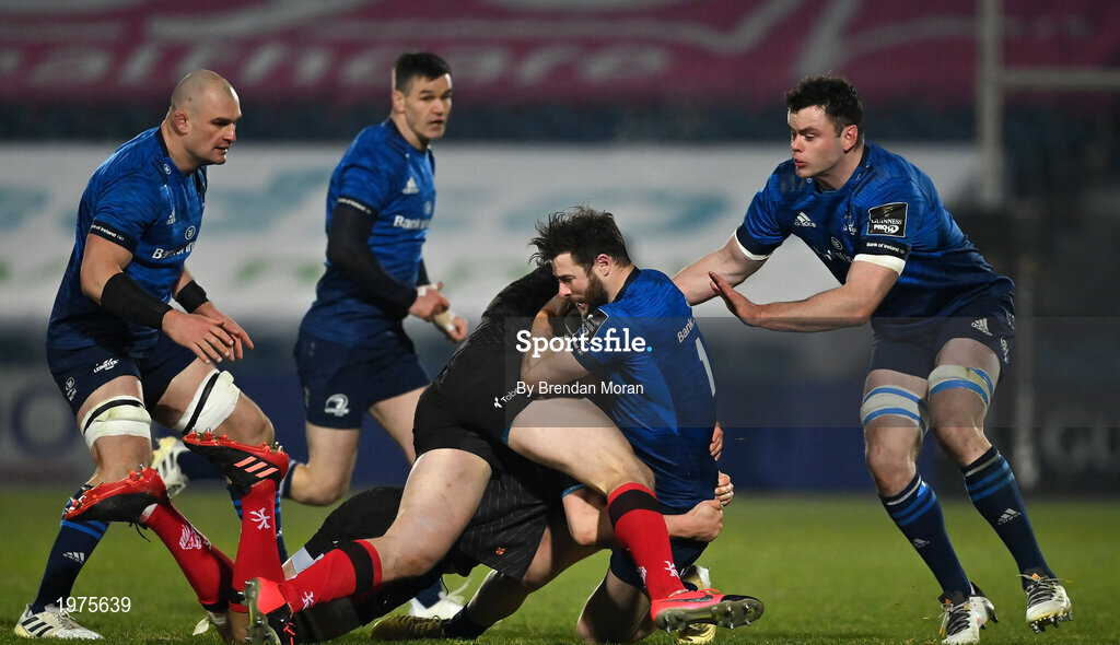 8 January 2021; Robbie Henshaw of Leinster is tackled by Greg Jones and Stuart McCloskey of Ulster during the Guinness PRO14 match between Leinster and Ulster at the RDS Arena in Dublin. Photo by Brendan Moran/Sportsfile
