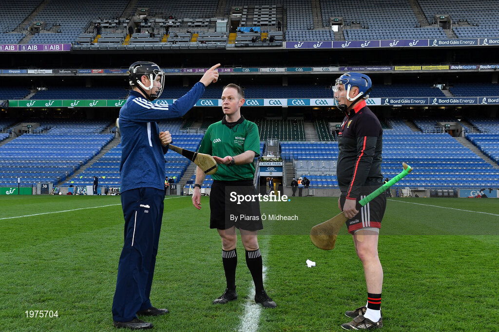22 November 2020; Referee Chris Mooney with team captains Brian Byrne of Kildare and Stephen Keith of Down prior to the Christy Ring Cup Final match between Down and Kildare at Croke Park in Dublin. Photo by Piaras Ó Mídheach/Sportsfile