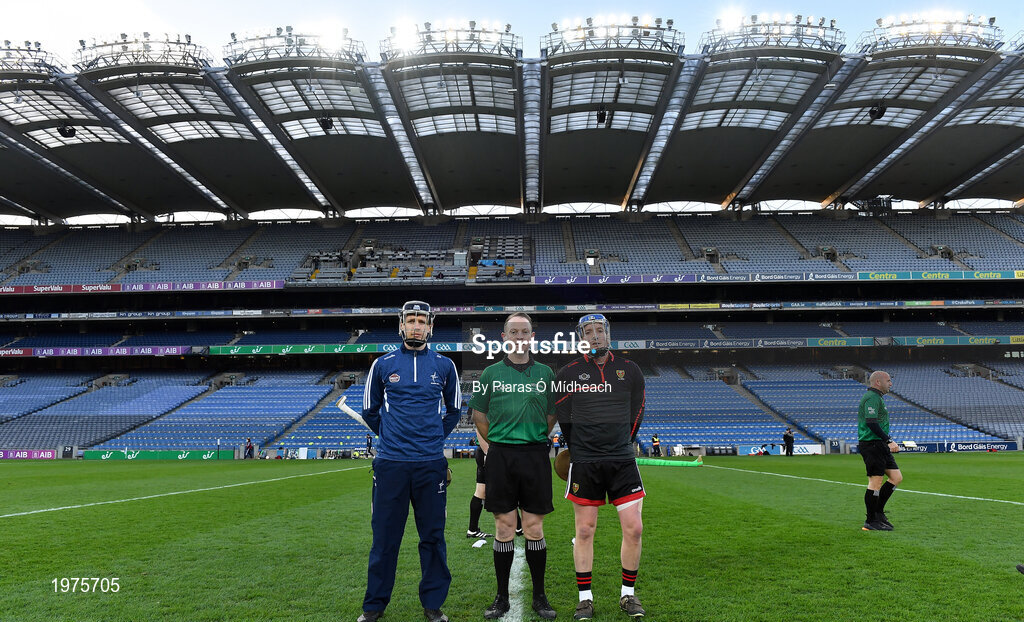 22 November 2020; Referee Chris Mooney with team captains Brian Byrne of Kildare and Stephen Keith of Down prior to the Christy Ring Cup Final match between Down and Kildare at Croke Park in Dublin. Photo by Piaras Ó Mídheach/Sportsfile
