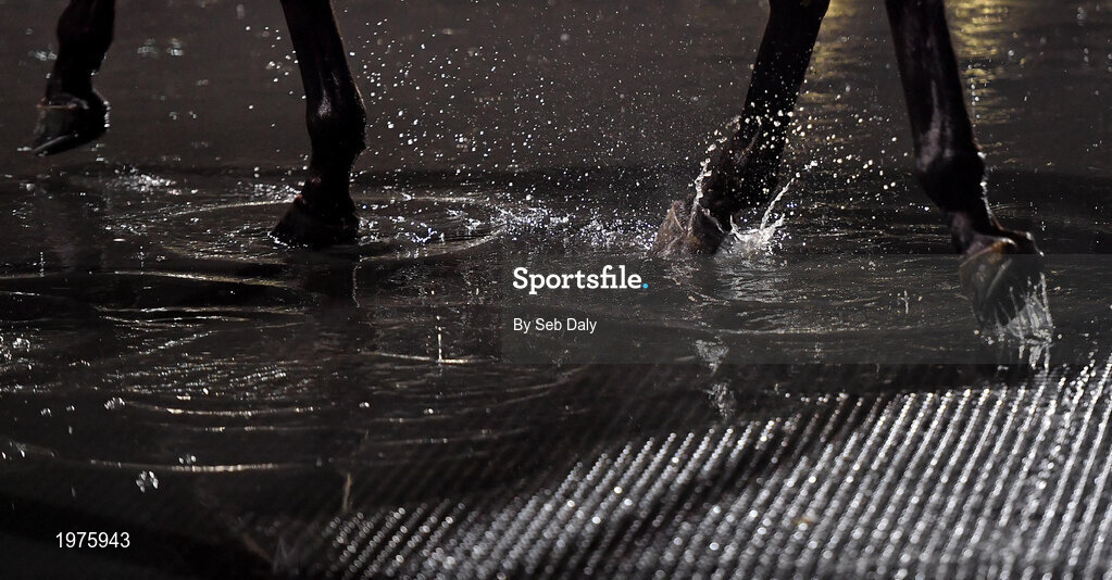 11 January 2021; A horse walks through a puddle in the parade ring prior to the Join Us On Instagram @dundalk_stadium Handicap DIV II at Dundalk Stadium, in Louth. Photo by Seb Daly/Sportsfile