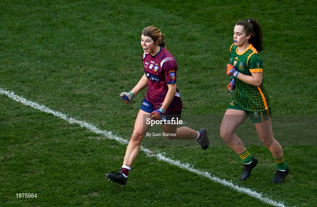 20 December 2020; Anna Jones of Westmeath celebrates after scoring her side's third goal during the TG4 All-Ireland Intermediate Ladies Football Championship Final match between Meath and Westmeath at Croke Park in Dublin. Photo by Sam Barnes/Sportsfile