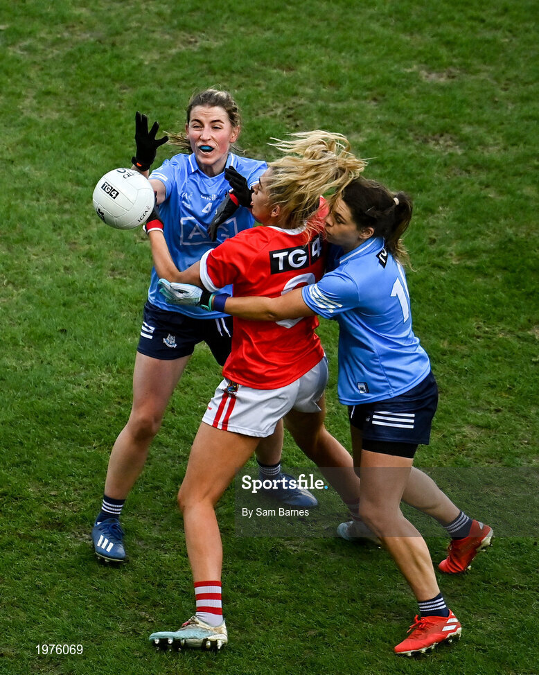 20 December 2020; Máire O'Callaghan of Cork in action against Aoife Kane, left, and Noelle Healy of Dublin during the TG4 All-Ireland Senior Ladies Football Championship Final match between Cork and Dublin at Croke Park in Dublin. Photo by Sam Barnes/Sportsfile