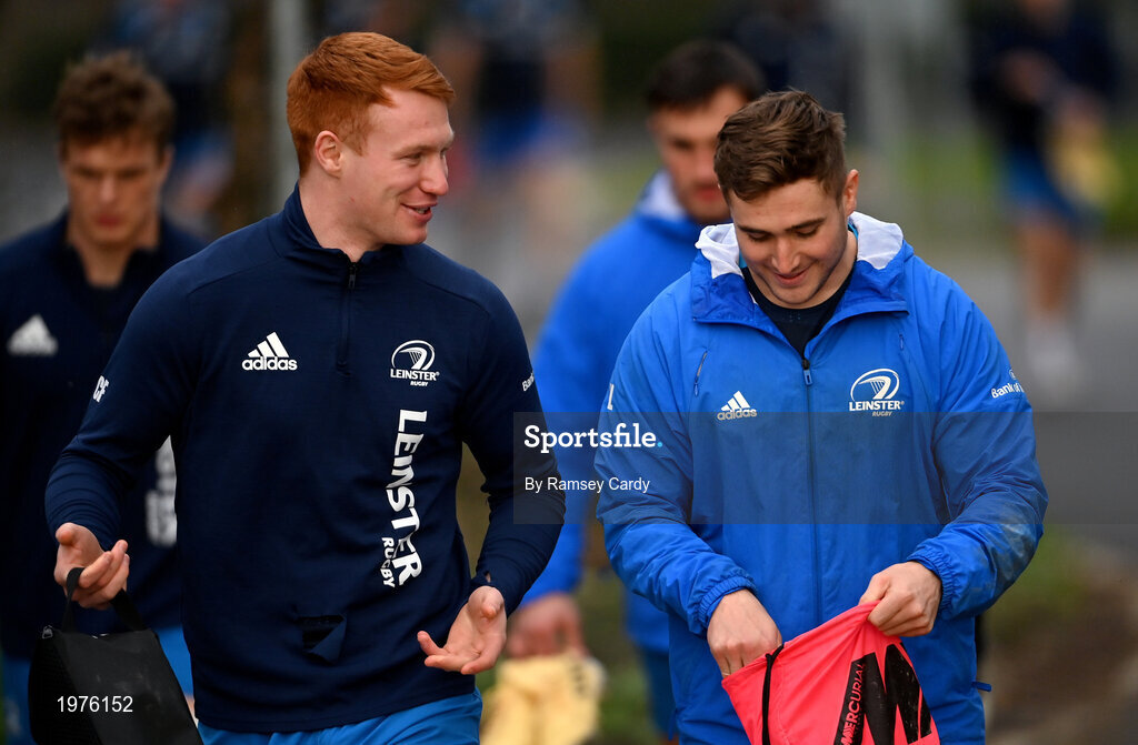 18 January 2021; Ciarán Frawley, left, and Jordan Larmour during Leinster Rugby squad training at UCD in Dublin. Photo by Ramsey Cardy/Sportsfile