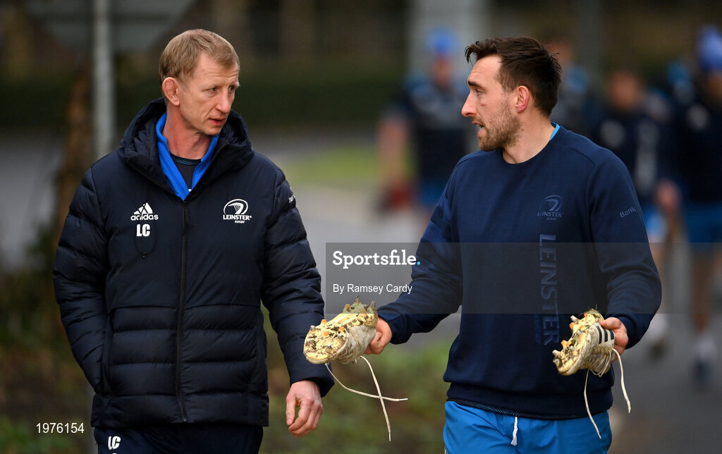18 January 2021; Head coach Leo Cullen, left, and Jack Conan during Leinster Rugby squad training at UCD in Dublin. Photo by Ramsey Cardy/Sportsfile