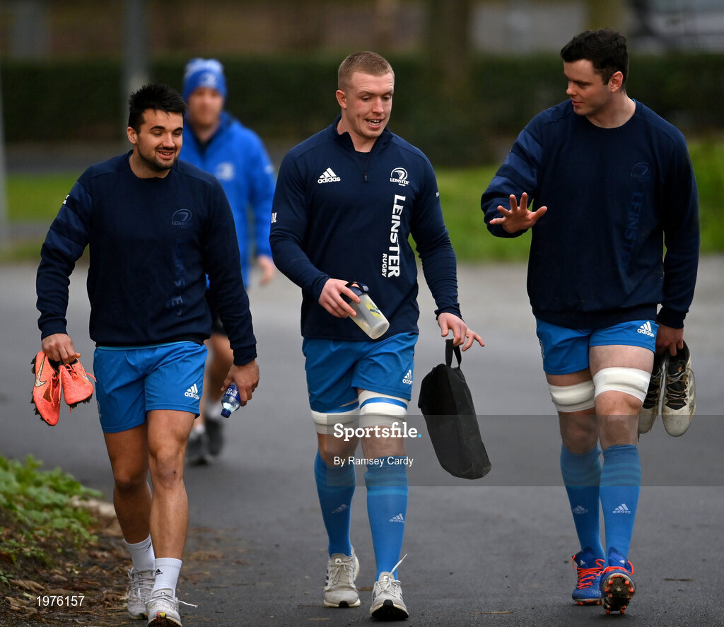 18 January 2021; Cian Kelleher, left, Dan Leavy, centre, and James Ryan during Leinster Rugby squad training at UCD in Dublin. Photo by Ramsey Cardy/Sportsfile