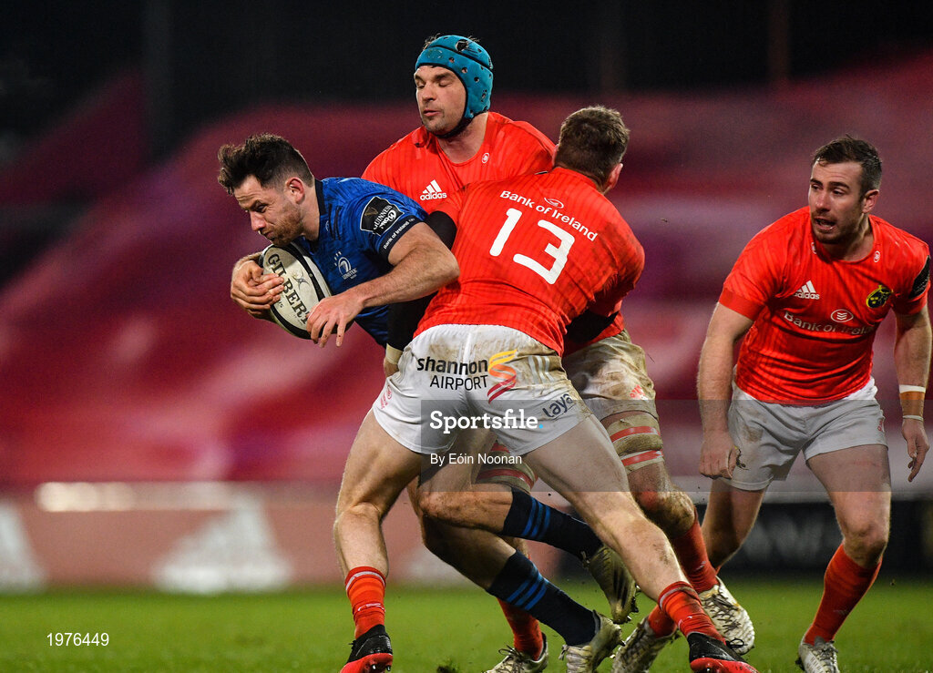 23 January 2021; Hugo Keenan of Leinster is tackled by Tadhg Beirne and Chris Farrell of Munster during the Guinness PRO14 match between Munster and Leinster at Thomond Park in Limerick. Photo by Eóin Noonan/Sportsfile