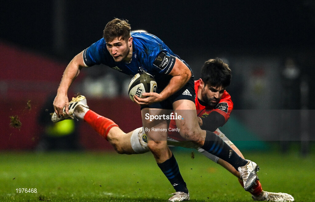 23 January 2021; Jordan Larmour of Leinster is tackled by Conor Murray of Munster during the Guinness PRO14 match between Munster and Leinster at Thomond Park in Limerick. Photo by Ramsey Cardy/Sportsfile
