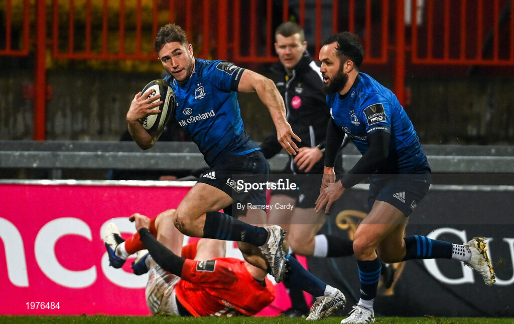 23 January 2021; Jordan Larmour of Leinster on the way to scoring his side's first try during the Guinness PRO14 match between Munster and Leinster at Thomond Park in Limerick. Photo by Ramsey Cardy/Sportsfile