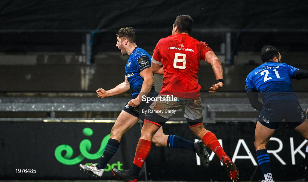 23 January 2021; Jordan Larmour of Leinster celebrates after scoring his side's first try during the Guinness PRO14 match between Munster and Leinster at Thomond Park in Limerick. Photo by Ramsey Cardy/Sportsfile