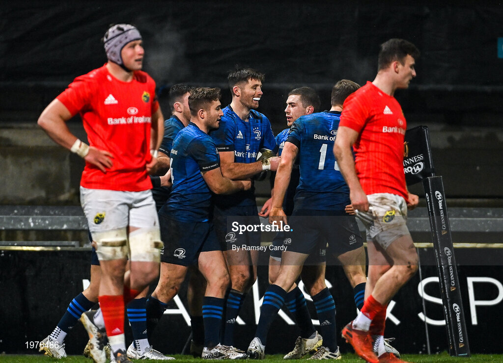 23 January 2021; Jordan Larmour of Leinster celebrates with team-mates Ross Byrne and Luke McGrath after scoring their side's first try during the Guinness PRO14 match between Munster and Leinster at Thomond Park in Limerick. Photo by Ramsey Cardy/Sportsfile