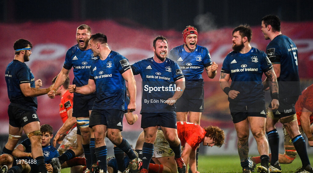 23 January 2021; Leinster players, from left, Thomas Clarkson, Ross Molony, Rónan Kelleher, Ed Byrne, Josh van der Flier, Andrew Porter and James Ryan celebrate at the final whistle of the Guinness PRO14 match between Munster and Leinster at Thomond Park in Limerick. Photo by Eóin Noonan/Sportsfile