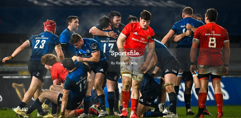 23 January 2021; Leinster players celebrate at the final whistle of the Guinness PRO14 match between Munster and Leinster at Thomond Park in Limerick. Photo by Ramsey Cardy/Sportsfile