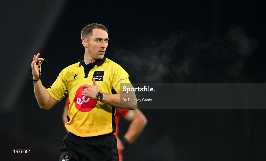 23 January 2021; Referee Andrew Brace during the Guinness PRO14 match between Munster and Leinster at Thomond Park in Limerick. Photo by Ramsey Cardy/Sportsfile