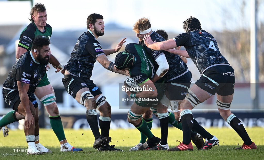 24 January 2021; Ultan Dillane of Connacht is tackled by Will Griffiths of Ospreys during the Guinness PRO14 match between Connacht and Ospreys at The Sportsground in Galway. Photo by Piaras Ó Mídheach/Sportsfile