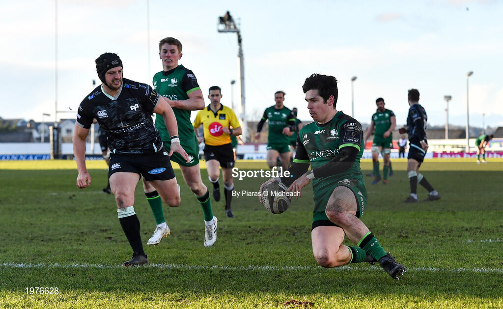 24 January 2021; Alex Wootton of Connacht scores his side's first try under pressure from Dan Evans of Ospreys during the Guinness PRO14 match between Connacht and Ospreys at The Sportsground in Galway. Photo by Piaras Ó Mídheach/Sportsfile