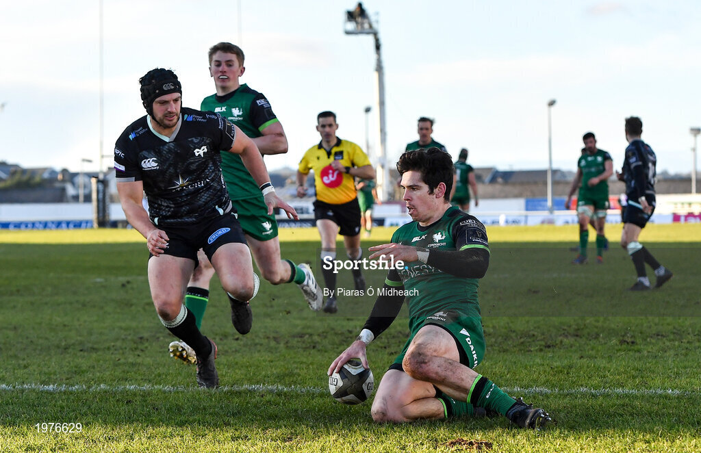 24 January 2021; Alex Wootton of Connacht scores his side's first try under pressure from Dan Evans of Ospreys during the Guinness PRO14 match between Connacht and Ospreys at The Sportsground in Galway. Photo by Piaras Ó Mídheach/Sportsfile