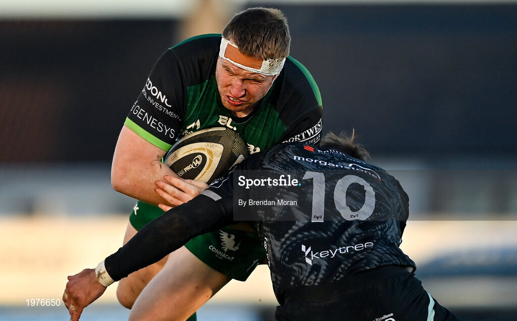 24 January 2021; Shane Delahunt of Connacht is tackled by Stephen Myler of Ospreys during the Guinness PRO14 match between Connacht and Ospreys at The Sportsground in Galway. Photo by Brendan Moran/Sportsfile
