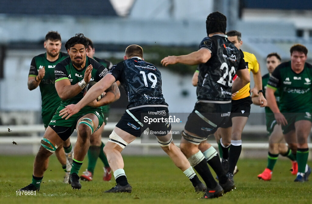 24 January 2021; Abraham Papali’i of Connacht in action against Lloyd Ashley of Ospreys the Guinness PRO14 match between Connacht and Ospreys at The Sportsground in Galway. Photo by Brendan Moran/Sportsfile