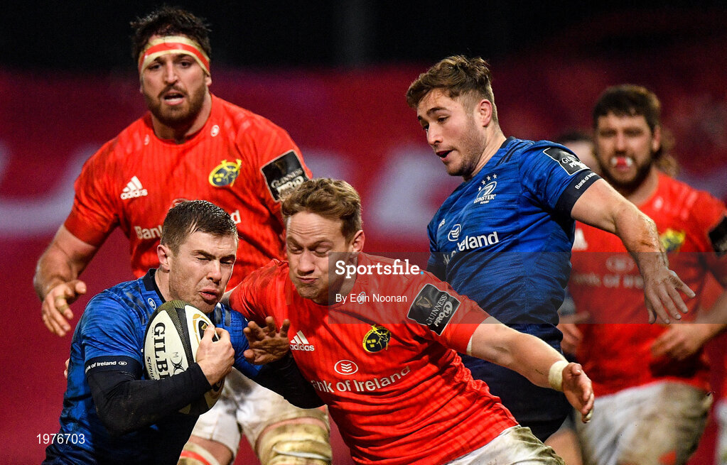23 January 2021; Luke McGrath of Leinster is tackled by Mike Haley of Munster during the Guinness PRO14 match between Munster and Leinster at Thomond Park in Limerick. Photo by Eóin Noonan/Sportsfile