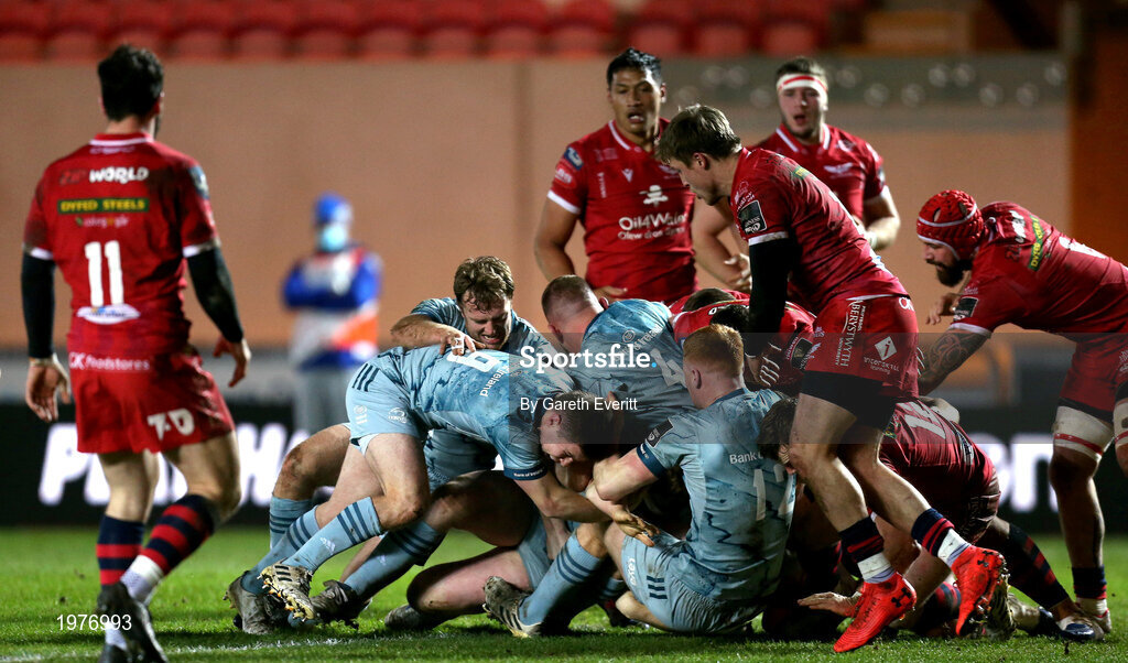 30 January 2021; Leinster players, Liam Turner, Luke McGrath, Ross Molony and Ciaran Frawley force team-mate James Tracy over for their side's second try during the Guinness PRO14 match between Scarlets and Leinster at Parc y Scarlets in Llanelli, Wales. Photo by Gareth Everitt/Sportsfile