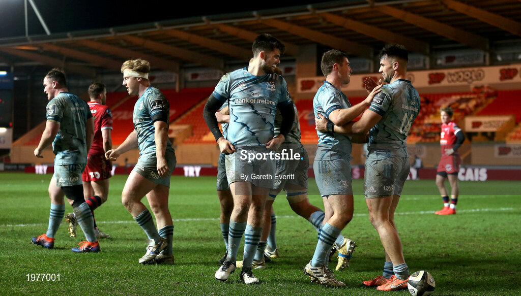 30 January 2021; Cian Kelleher of Leinster, right, celebrates after scoring his side's fourth try with team-mates Luke McGrath and Harry Byrne during the Guinness PRO14 match between Scarlets and Leinster at Parc y Scarlets in Llanelli, Wales. Photo by Gareth Everitt/Sportsfile