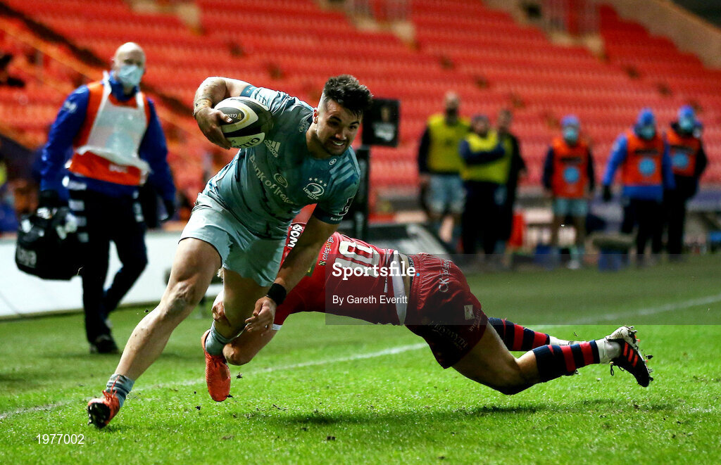 30 January 2021; Cian Kelleher of Leinster beats the tackle of Sam Costelow of Scarlets on the way to scoring his side's fourth try during the Guinness PRO14 match between Scarlets and Leinster at Parc y Scarlets in Llanelli, Wales. Photo by Gareth Everitt/Sportsfile