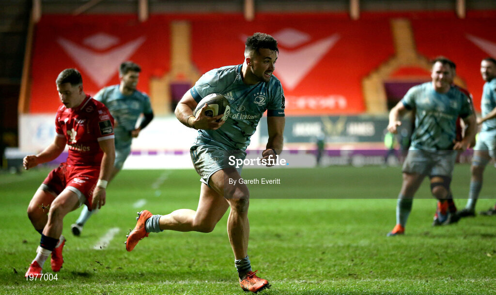 30 January 2021; Cian Kelleher of Leinster on the way to scoring his side's fourth try during the Guinness PRO14 match between Scarlets and Leinster at Parc y Scarlets in Llanelli, Wales. Photo by Gareth Everitt/Sportsfile