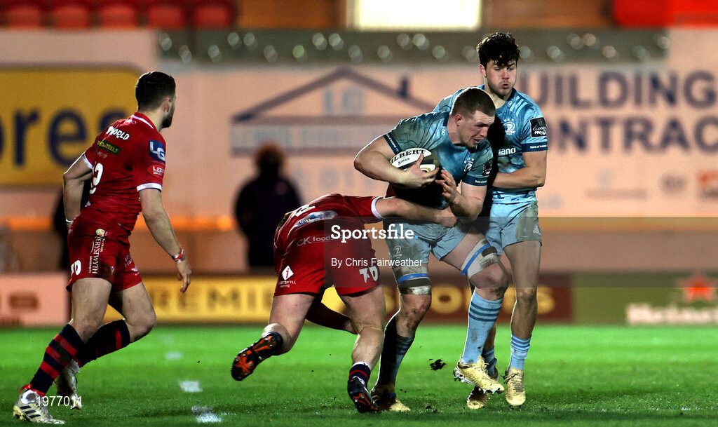 30 January 2021; Dan Leavy of Leinster is tackled by Javan Sebastian of Scarlets during the Guinness PRO14 match between Scarlets and Leinster at Parc y Scarlets in Llanelli, Wales. Photo by Chris Fairweather/Sportsfile