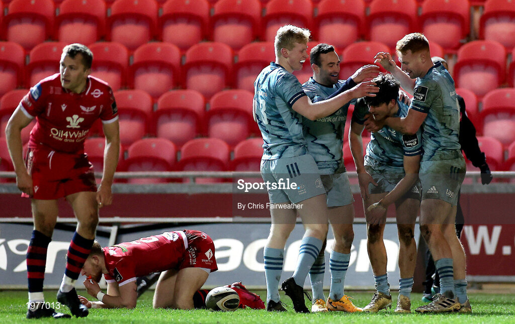30 January 2021; Max O’Reilly of Leinster celebrates with team-mates Jamie Osborne, Dave Kearney and Ciarán Frawley after scoring their side's sixth try during the Guinness PRO14 match between Scarlets and Leinster at Parc y Scarlets in Llanelli, Wales. Photo by Chris Fairweather/Sportsfile
