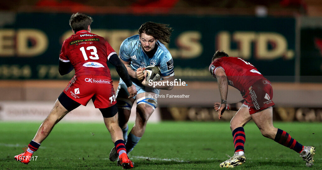 30 January 2021; Jack Dunne of Leinster in action against Tyler Morgan and Steff Hughes of Scarlets during the Guinness PRO14 match between Scarlets and Leinster at Parc y Scarlets in Llanelli, Wales. Photo by Chris Fairweather/Sportsfile