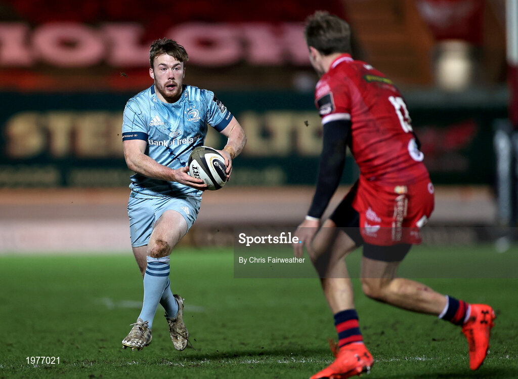 30 January 2021; David Hawkshaw of Leinster makes a break on the way to scoring his side's seventh try during the Guinness PRO14 match between Scarlets and Leinster at Parc y Scarlets in Llanelli, Wales. Photo by Chris Fairweather/Sportsfile