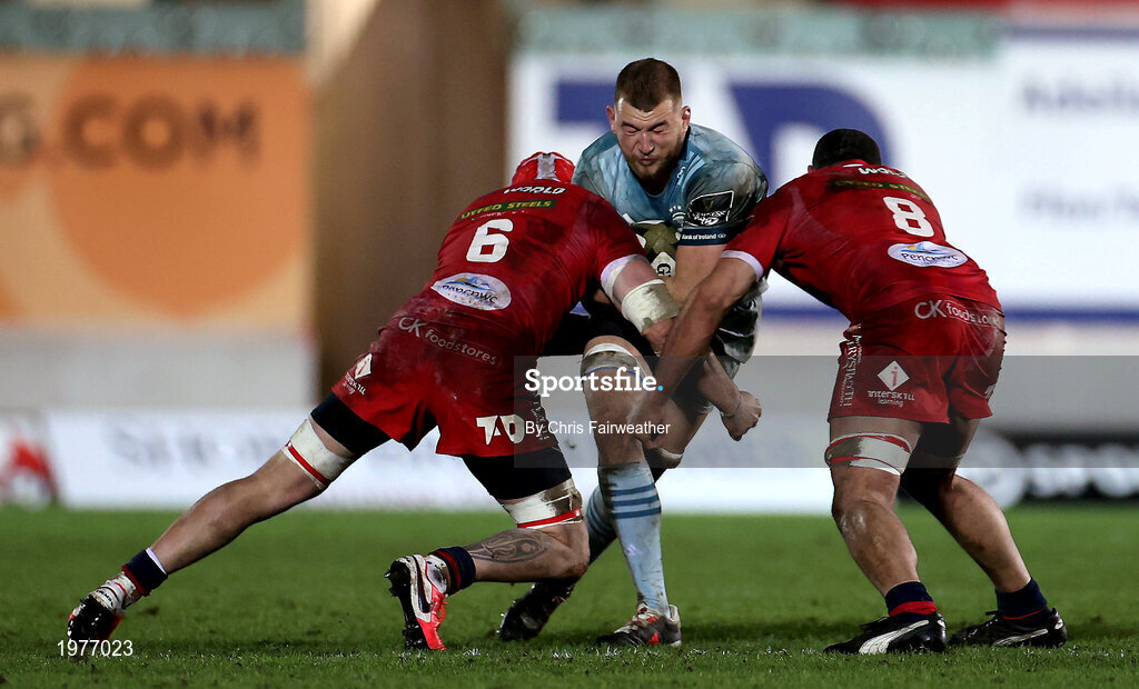 30 January 2021; Ross Molony of Leinster is tackled by Blade Thomson, left, and Uzair Cassiem of Scarlets during the Guinness PRO14 match between Scarlets and Leinster at Parc y Scarlets in Llanelli, Wales. Photo by Chris Fairweather/Sportsfile