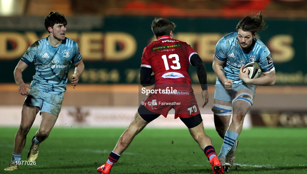 30 January 2021; Jack Dunne of Leinster in action against Tyler Morgan of Scarlets during the Guinness PRO14 match between Scarlets and Leinster at Parc y Scarlets in Llanelli, Wales. Photo by Chris Fairweather/Sportsfile