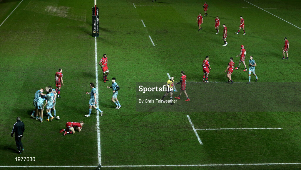 30 January 2021; Max O’Reilly of Leinster is congratulated by team-mates Ciarán Frawley, Dave Kearney and Jamie Osborne after scoring their side's sixth try during the Guinness PRO14 match between Scarlets and Leinster at Parc y Scarlets in Llanelli, Wales. Photo by Chris Fairweather/Sportsfile