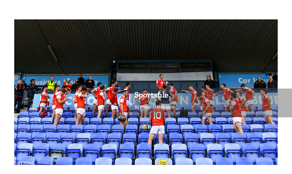 20 September 2020; Cool Cuala. No player in this well spread-out group is getting carried away or going overboard during captain Darragh O’Connell’s acceptance speech in Parnell Park. It’s not too surprising that Cuala are taking it all in their stride as this is their fifth Dublin hurling triumph in the last six seasons. Photo by Piaras Ó Mídheach/Sportsfile This image may be reproduced free of charge when used in conjunction with a review of the book "A Season of Sundays 2020". All other usage © Sportsfile