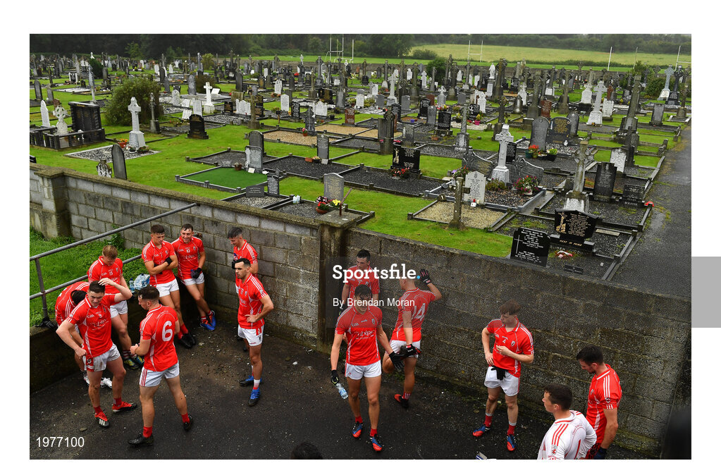 22 August 2020; The Far Side. It’s said that building a wall around a graveyard is pointless because those inside can’t come out and those outside don’t want to get in, but the East Kerry footballers have found a use for it – a place to hold a half-time team meeting. At least they won’t be overheard. Photo by Brendan Moran/Sportsfile This image may be reproduced free of charge when used in conjunction with a review of the book "A Season of Sundays 2020". All other usage © Sportsfile