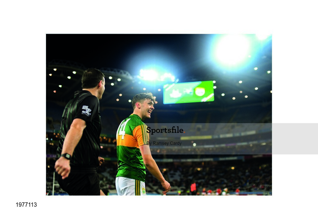 25 January 2020; Doing it all with a smile on his face. David Clifford, Kerry’s new team captain, shares a pre-match joke with referee Seán Hurson but when the ball is thrown in it’s not so light-hearted as Dublin and Kerry begin the league with another titanic encounter. It’s a reminder of what we’ve missed since the two-game All-Ireland final in 2019 Photo by Ramsey Cardy/Sportsfile This image may be reproduced free of charge when used in conjunction with a review of the book "A Season of Sundays 2020". All other usage © Sportsfile