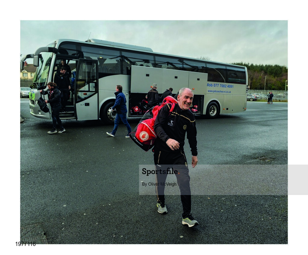 5 January 2020; That winning smile. Mickey Harte, the longest serving of the current football managers, looks as energised, as enthusiastic, as sprightly as ever as he bounds from the team bus into Healy Park to start his 18th season at the helm in Tyrone. But how would it all end? Photo by Oliver McVeigh/Sportsfile This image may be reproduced free of charge when used in conjunction with a review of the book "A Season of Sundays 2020". All other usage © Sportsfile