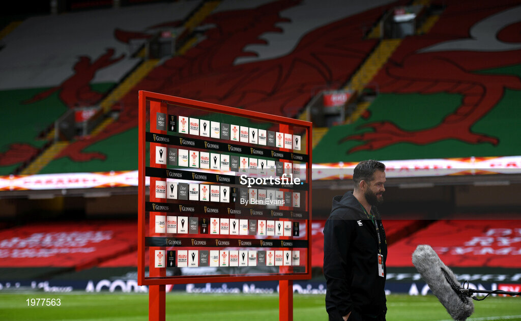 7 February 2021; Ireland head coach Andy Farrell is interviewed by broadcasters prior to the Guinness Six Nations Rugby Championship match between Wales and Ireland at the Principality Stadium in Cardiff, Wales. Photo by Ben Evans/Sportsfile