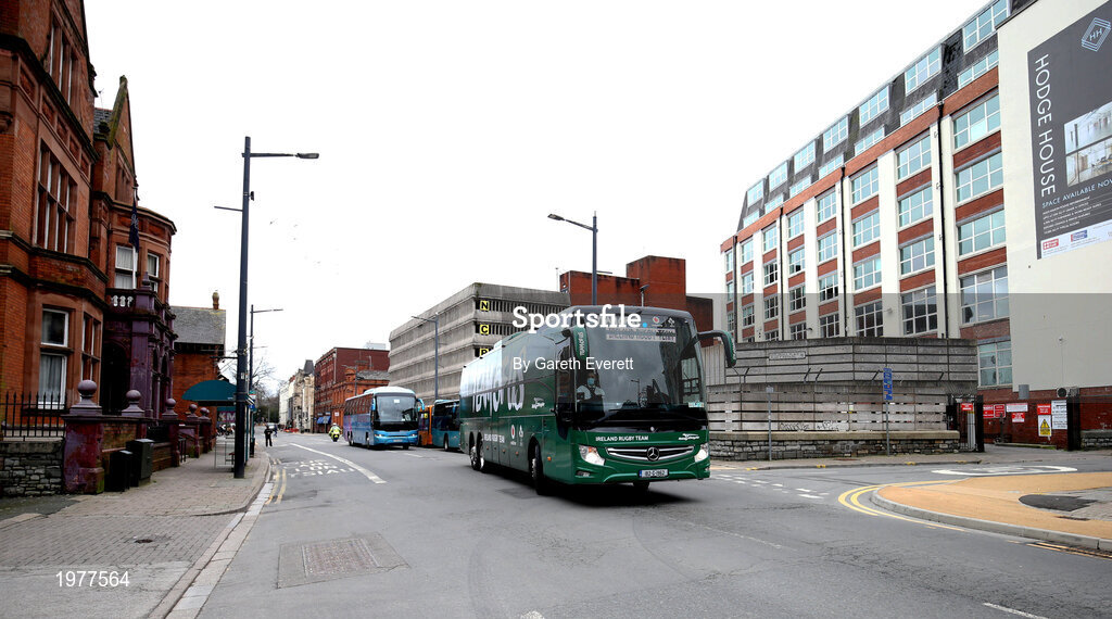 7 February 2021; The Ireland team bus arrives prior to the Guinness Six Nations Rugby Championship match between Wales and Ireland at the Principality Stadium in Cardiff, Wales. Photo by Gareth Everett/Sportsfile