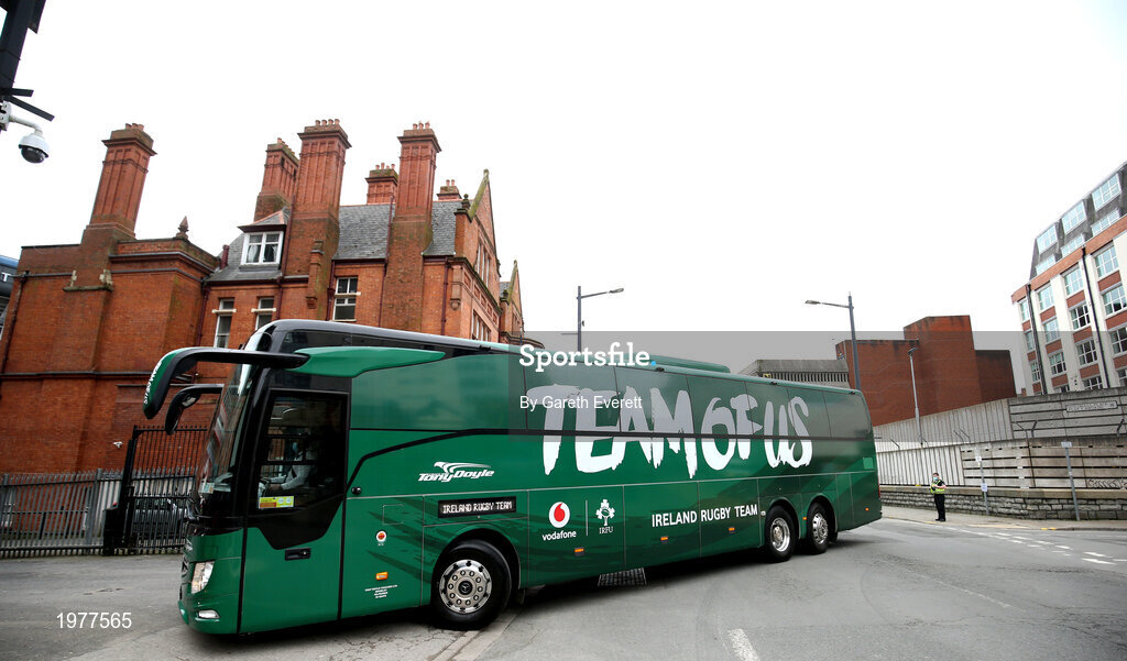 7 February 2021; The Ireland team bus arrives prior to the Guinness Six Nations Rugby Championship match between Wales and Ireland at the Principality Stadium in Cardiff, Wales. Photo by Gareth Everett/Sportsfile