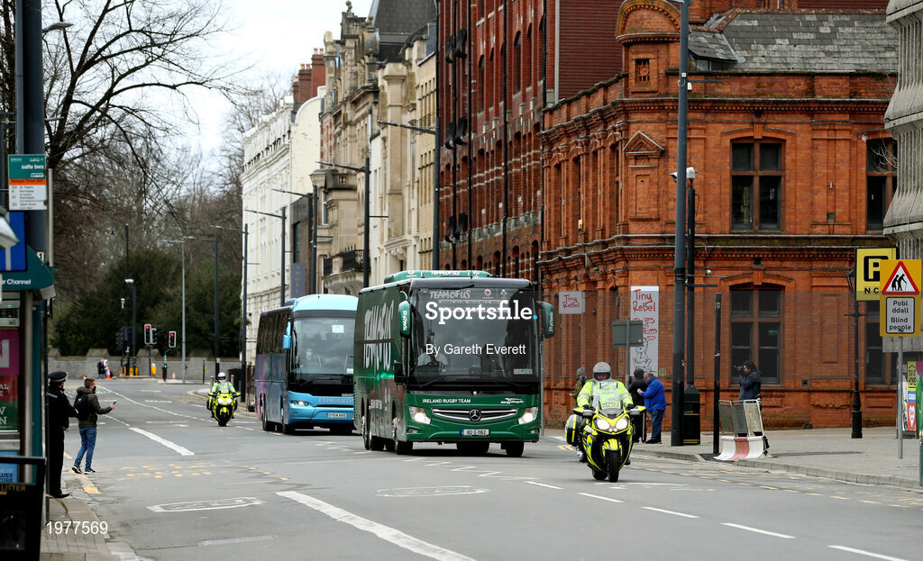 7 February 2021; The Ireland team bus makes it's way down a deserted Westgate Street prior to the Guinness Six Nations Rugby Championship match between Wales and Ireland at the Principality Stadium in Cardiff, Wales. Photo by Gareth Everett/Sportsfile