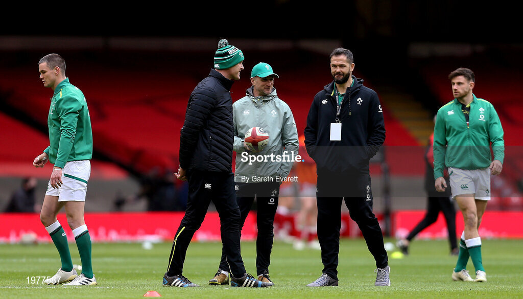7 February 2021; Ireland head coach Andy Farrell with forwards coach Paul O'Connell, left, and assistant coach Mike Catt, right, prior to the Guinness Six Nations Rugby Championship match between Wales and Ireland at the Principality Stadium in Cardiff, Wales. Photo by Gareth Everett/Sportsfile