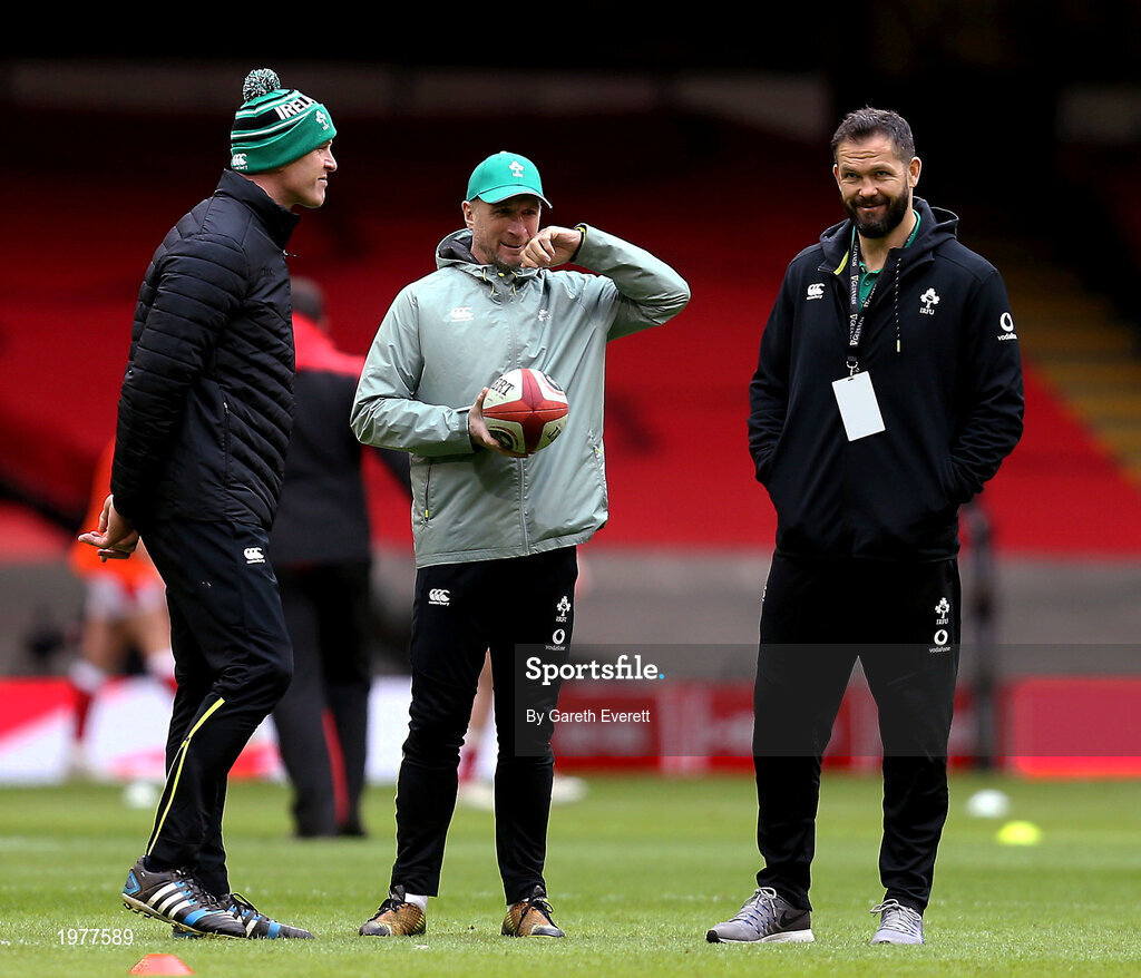 7 February 2021; Ireland head coach Andy Farrell with forwards coach Paul O'Connell, left, and assistant coach Mike Catt, right, prior to the Guinness Six Nations Rugby Championship match between Wales and Ireland at the Principality Stadium in Cardiff, Wales. Photo by Gareth Everett/Sportsfile