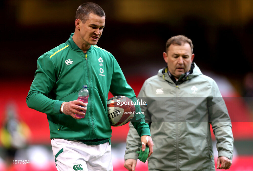 7 February 2021; Jonathan Sexton of Ireland with skills & kicking coach Richie Murphy prior to the Guinness Six Nations Rugby Championship match between Wales and Ireland at the Principality Stadium in Cardiff, Wales. Photo by Gareth Everett/Sportsfile