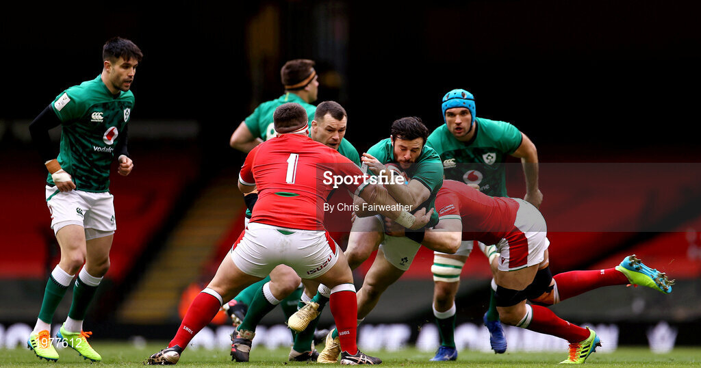 7 February 2021; Robbie Henshaw of Ireland is tackled by Alun Wyn Jones and Wyn Jones of Wales during the Guinness Six Nations Rugby Championship match between Wales and Ireland at the Principality Stadium in Cardiff, Wales. Photo by Chris Fairweather/Sportsfile