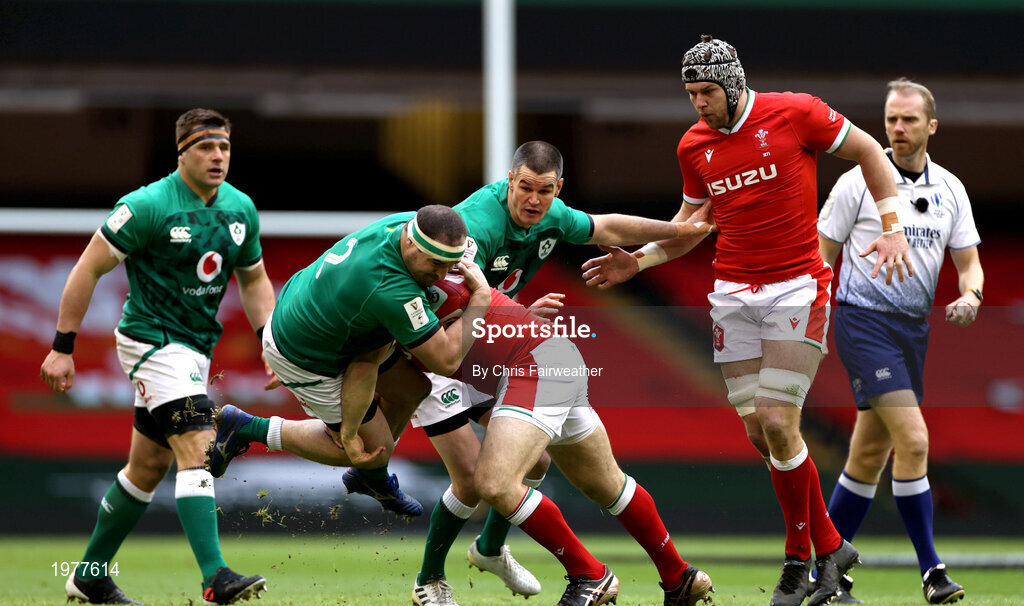 7 February 2021; Rob Herring of Ireland is tackled by Ken Owens of Wales during the Guinness Six Nations Rugby Championship match between Wales and Ireland at the Principality Stadium in Cardiff, Wales. Photo by Chris Fairweather/Sportsfile