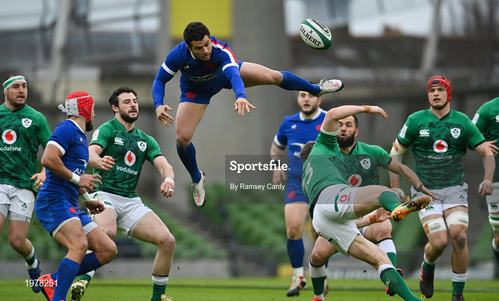 14 February 2021; Brice Dulin of France in action against Garry Ringrose of Ireland during the Guinness Six Nations Rugby Championship match between Ireland and France at the Aviva Stadium in Dublin. Photo by Ramsey Cardy/Sportsfile