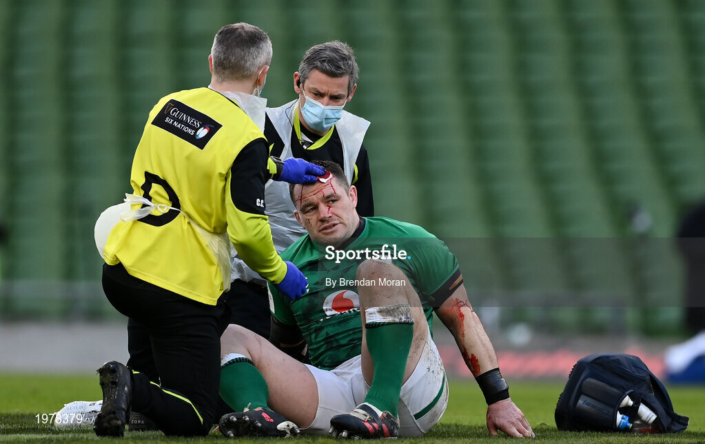 14 February 2021; Cian Healy of Ireland is treated for a blood injury after an accidental clash of heads with team-mate Iain Henderson during the Guinness Six Nations Rugby Championship match between Ireland and France at the Aviva Stadium in Dublin. Photo by Brendan Moran/Sportsfile