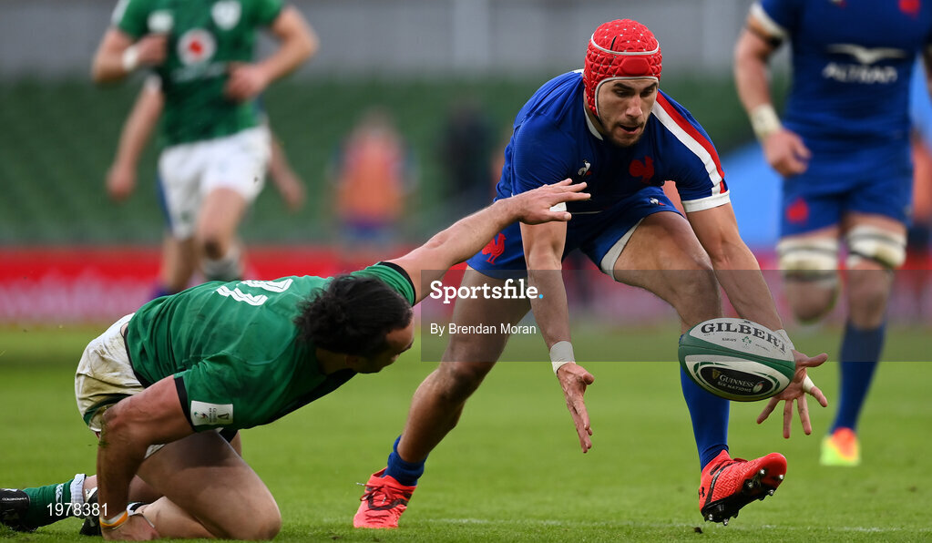 14 February 2021; Gabin Villière of France is tackled by James Lowe of Ireland during the Guinness Six Nations Rugby Championship match between Ireland and France at the Aviva Stadium in Dublin. Photo by Brendan Moran/Sportsfile